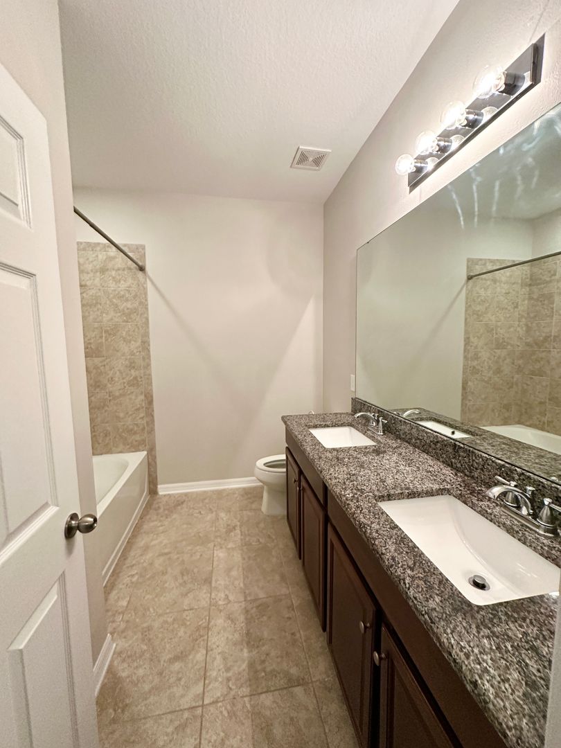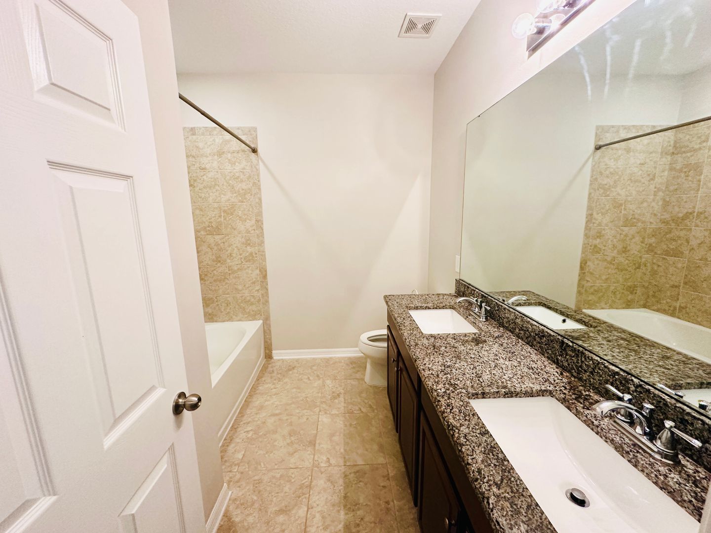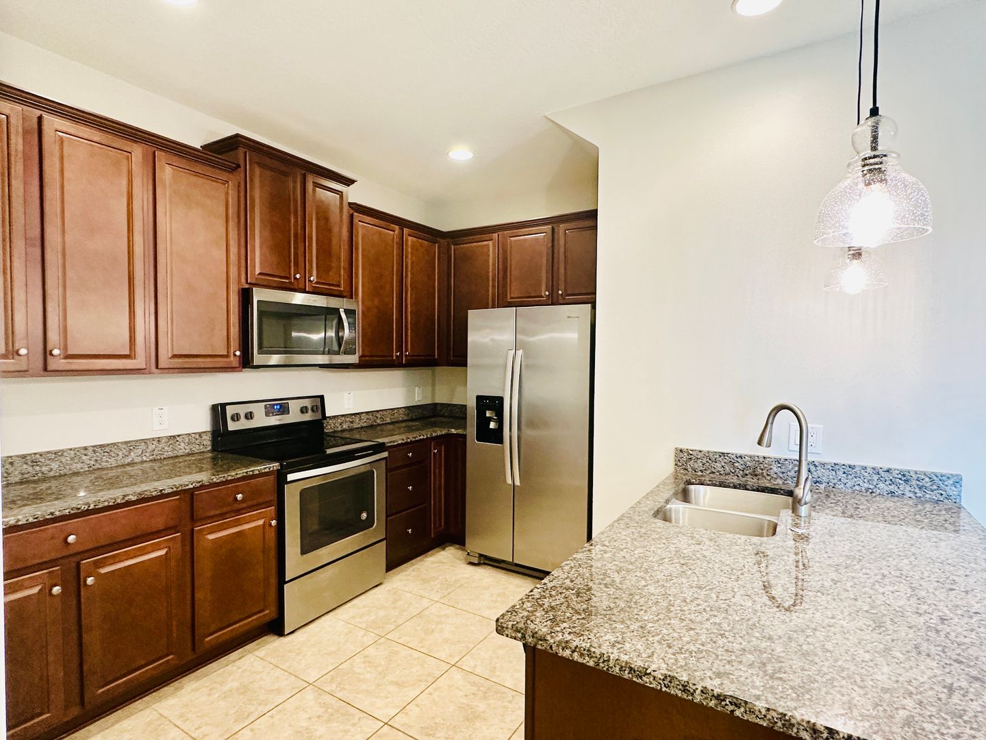 The residence features 4 bedrooms, 2.5 bathrooms, and a 2-car garage, with new luxury vinyl flooring throughout. A grand high-ceiling foyer welcomes you into a spacious living area and open kitchen with granite countertops, rich wood cabinetry, and stainless-steel appliances. The first-floor primary suite offers dual stone-top vanities and walk-in closets.