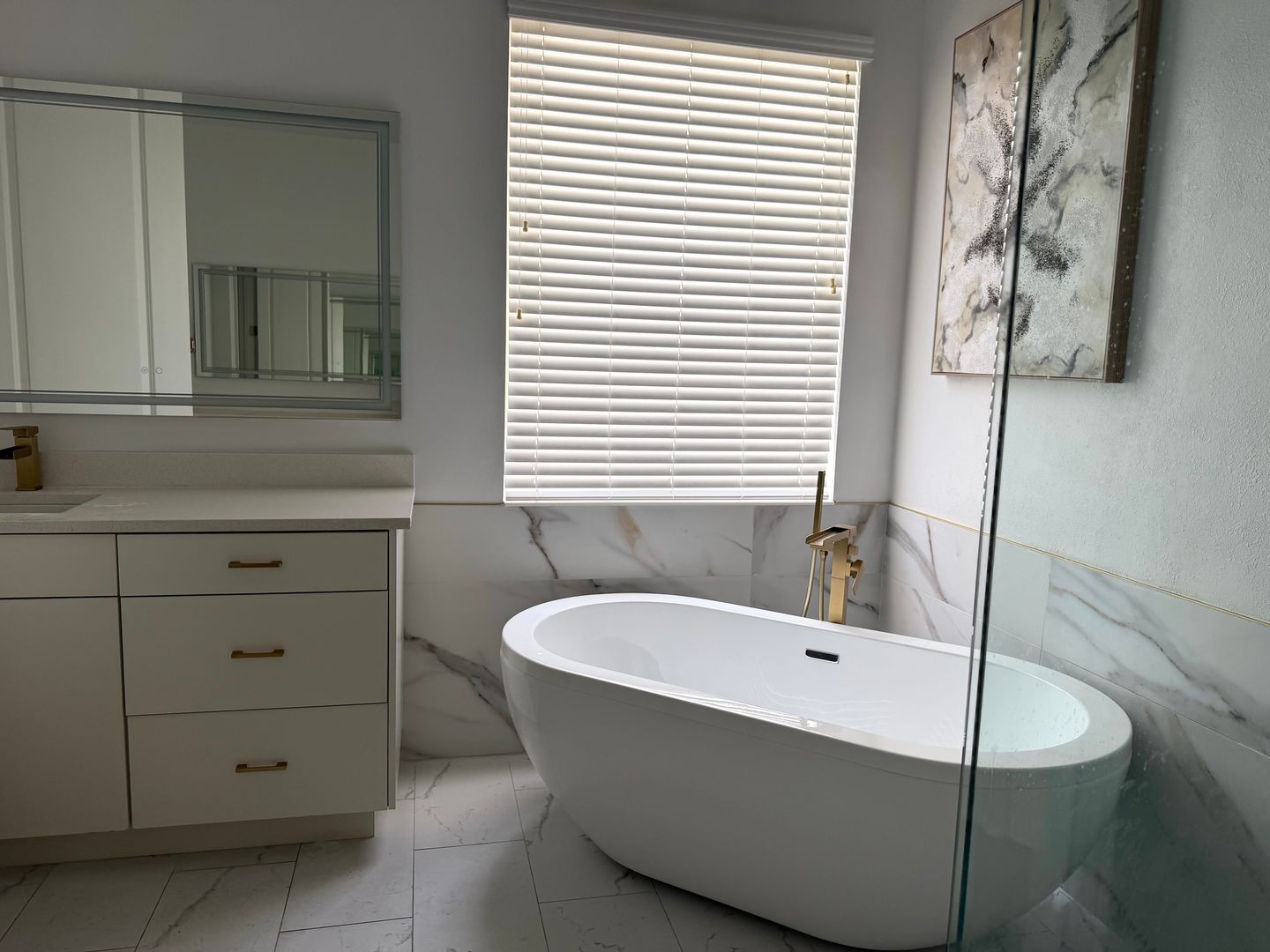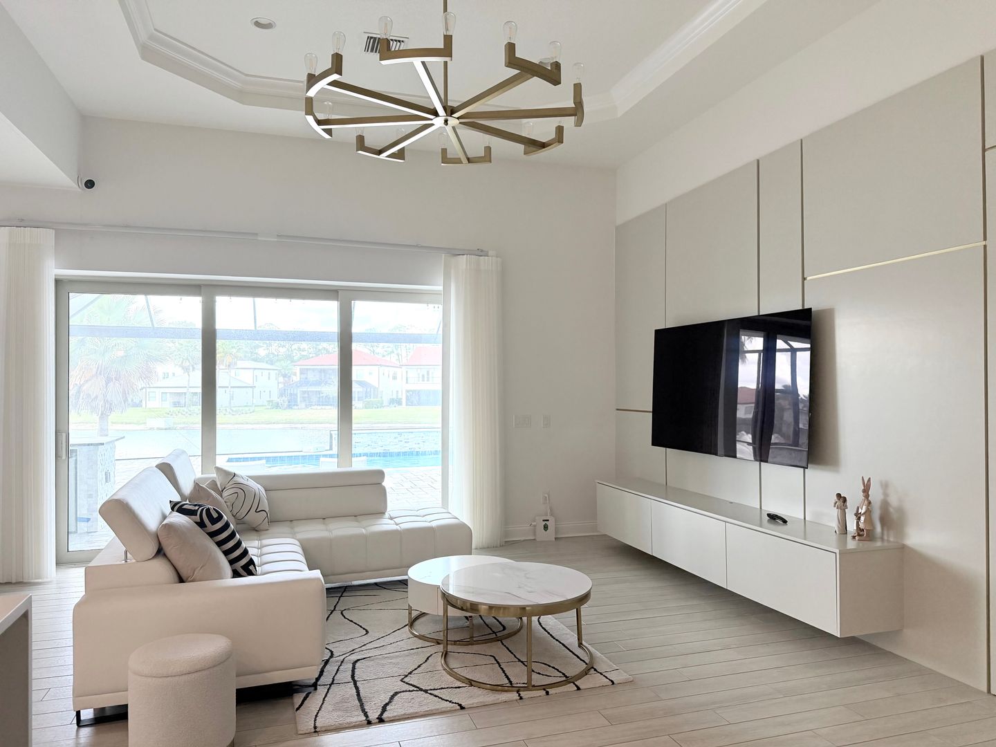 Live in style in this stunning Orlando-area estate featuring designer interiors, soaring ceilings, and gold accents throughout. The chef’s kitchen boasts a waterfall quartz island, double wall ovens, and a wine cooler. The spa-like primary bath includes a freestanding soaking tub and frameless glass shower.